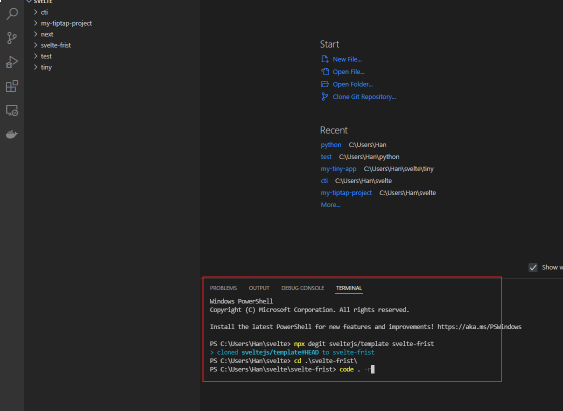 이제 작업을 위해서 Svelte 작업할 경로를 설정한 후 VS Code를 실행하도록 하자.