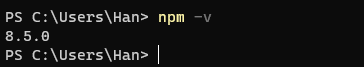 명령 프롬프트에서 npm 명령을 사용해, 설치가 정상적으로 되었는지 확인하자.