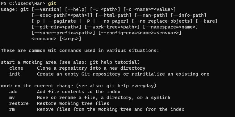 아래와 같이 git 설명이 출력된다면, 잘 설치가 된 것이다.