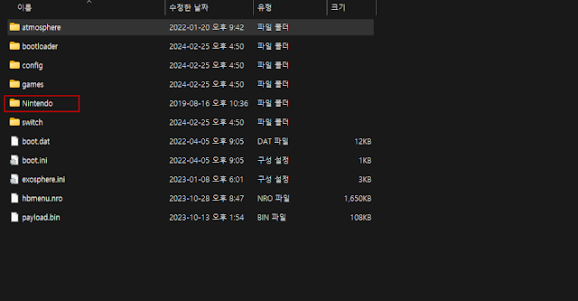 atmosphere - 커스텀 펌웨어 파일이 위치, 내부에 커스텀 펌웨어를 실행하고, 운영하기 위한 다양한 파일이 위치한다. 경로중 contents는 사용자 패치를 적용하는 용도로 사용된다.