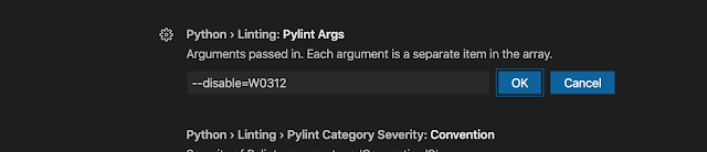 아래와 같이 Pylint Args를 추가하면 보다 다양한 코드를 볼 수 있다. 다만 아래와 같이 특정 코드만 비활성화 하는 추가 설정을 args로 직접 추가하게 되면, 전체적인 구성이 args를 따라가게 되어, 아래 코드만 비활성화 되고 전체가 활성화 되게 된다.