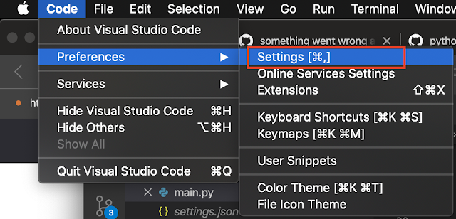 추가로 만약 PyLint 오류가 번거로운 상황이 발생하면, 글로벌 설정을 통해 조정이 가능하다. 아래 그림과 같이 Code -> Preferences->Settings로 이동하여 Linting을 설정할 수 있다.
