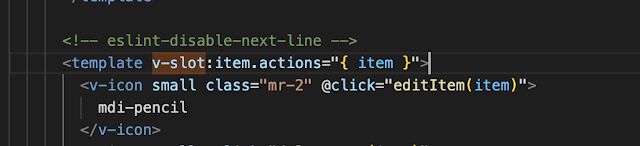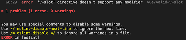 Vue - Eslint 라인 비활성화, error 'v-slot' directive doesn't support any modifier 해결