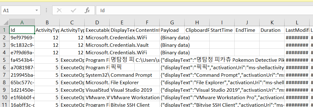 WxTCmd 는 Windows 10 기준 C:\Users\singl\AppData\Local\ConnectedDevicesPlatform 에 위치한 ActivitiesCache.db를 -f 옵션으로 지정하여 분석파일을 --cvs 를 통해 생성하는 방식으로 사용이 가능하다.