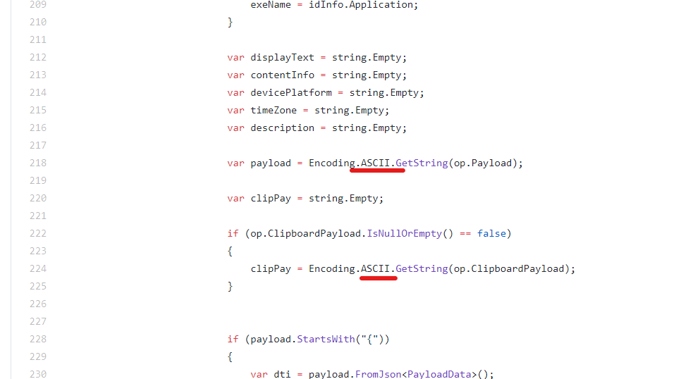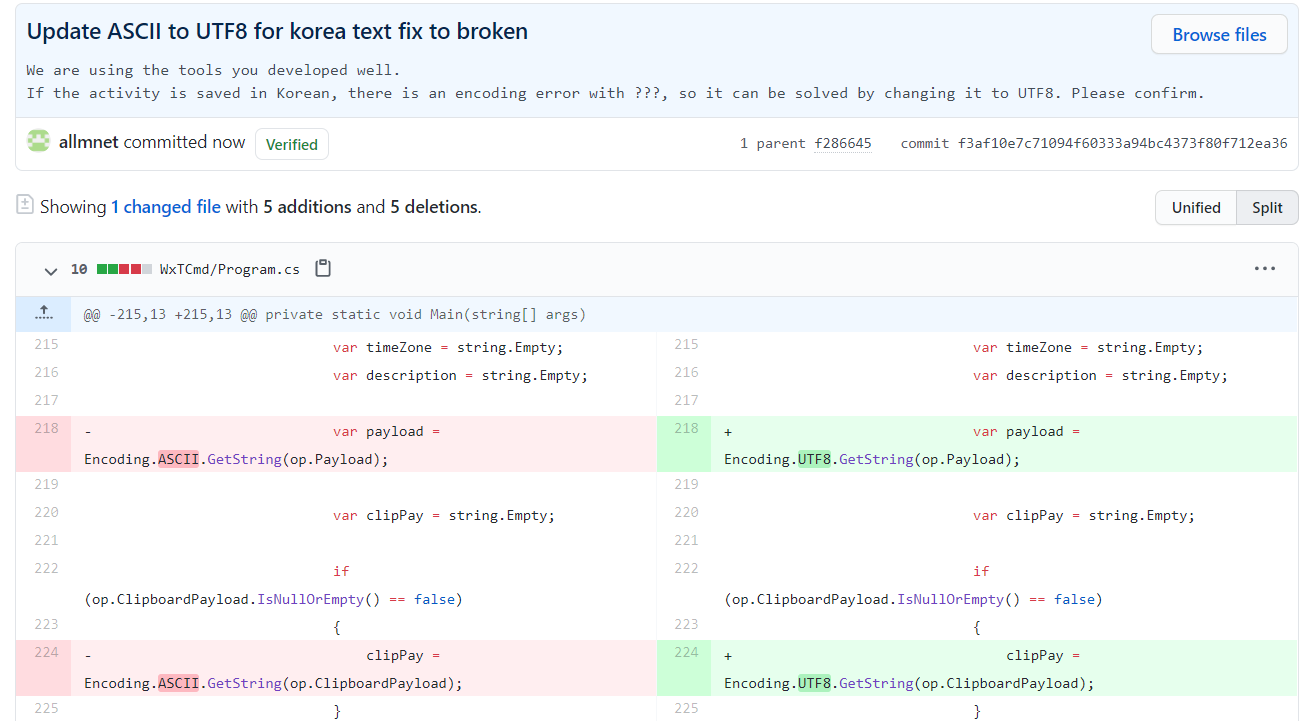인코딩 문제로 직감하고 github의 개발자 repo를 확인하여 코드를 확인해 보니, 총 4곳에서 인코딩을 UTF-8이 아닌 ASCII로 진행하고 있었다.github.com/EricZimmerman/WxTCmd