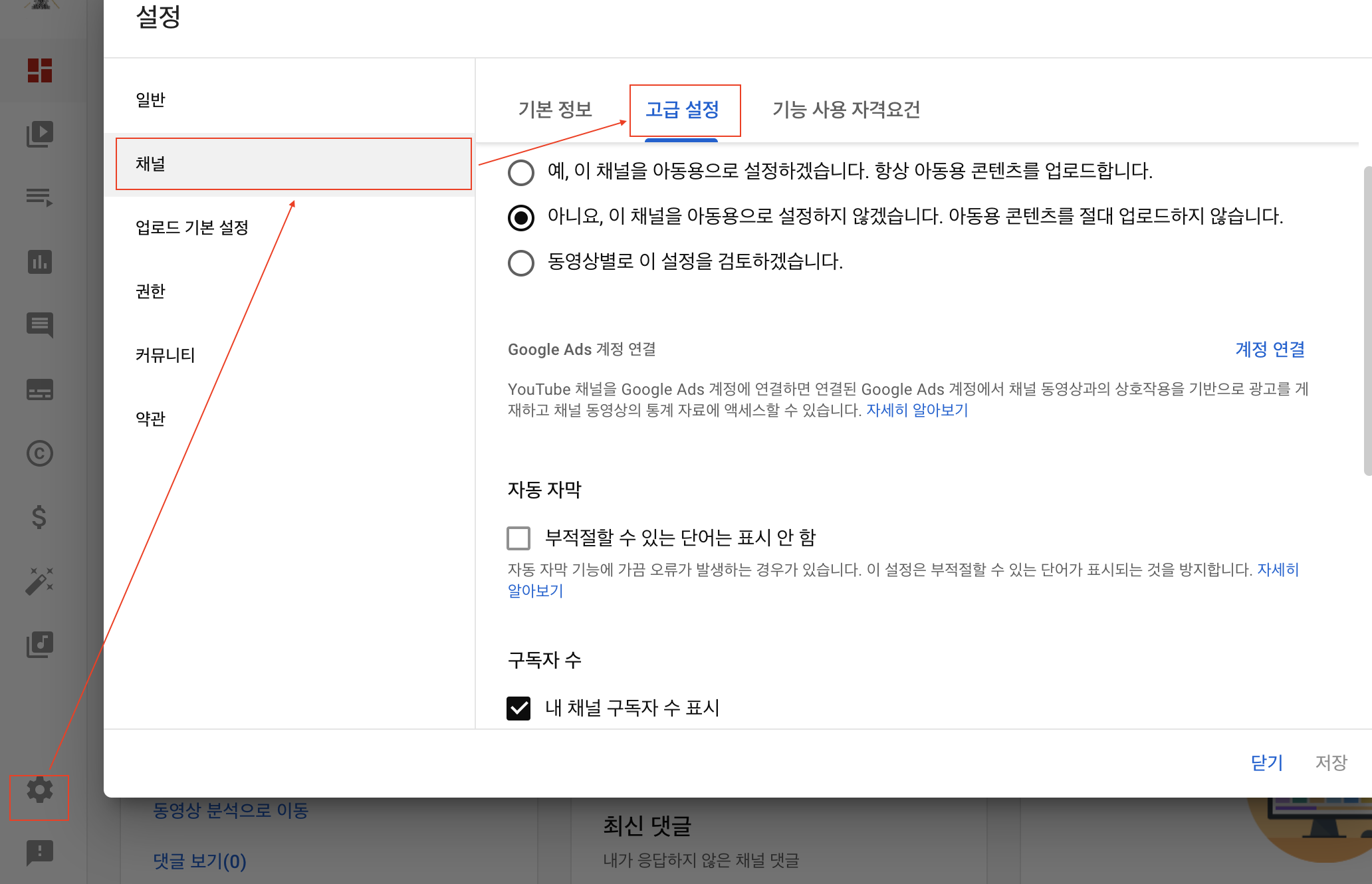 이 후 설정 -> 채널 -> 고급설정으로 들어간다.