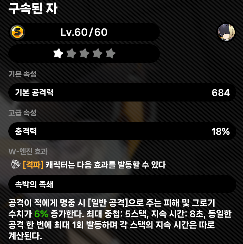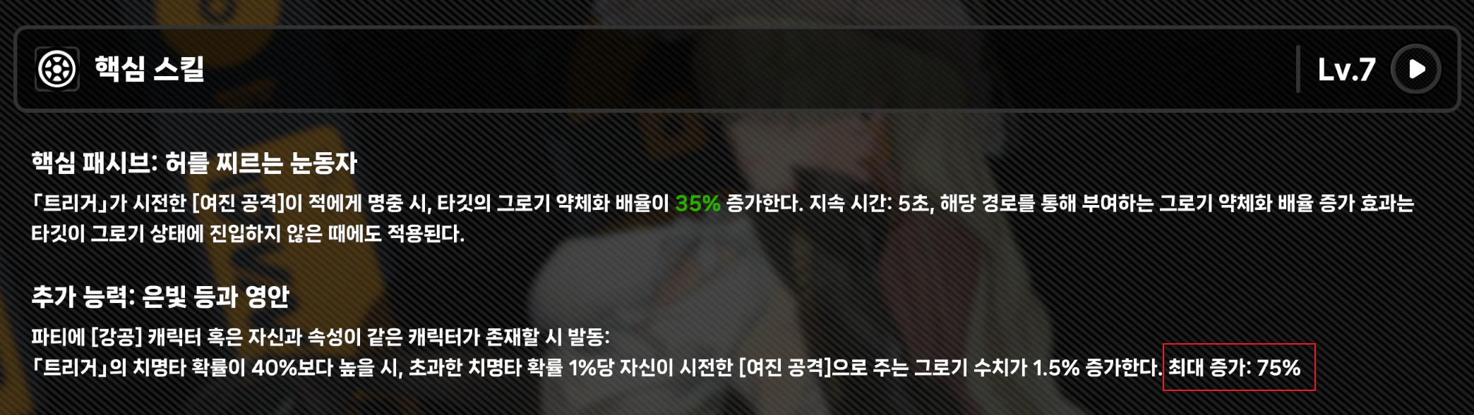 트리거는 여진 공격에 특화된 캐릭터로, 치명타 확률 증가에 따른 여진 공격 그로그 수치가 증가하게 됩니다.
